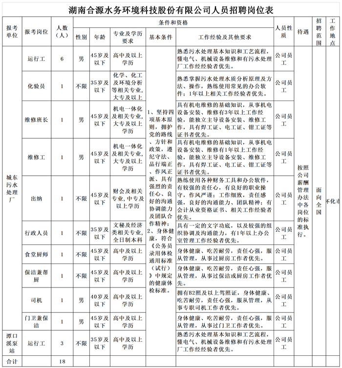 湖南合源水務(wù)環(huán)境科技股份有限公司人員招聘崗位表