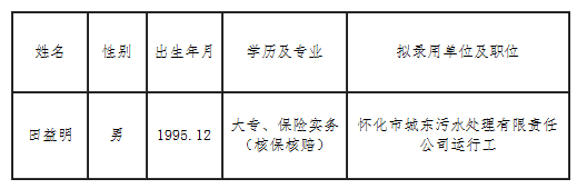 經(jīng)筆試、面試、體檢等程序,擬錄用田益明為懷化市城東污水處理有限責(zé)任公司運(yùn)行工現(xiàn)予以公示。公示時(shí)間為2021年7月19日—2021年7月21日,如有異議者請(qǐng)向湖南合源水務(wù)環(huán)境科技股份有限公司綜合管理部提出,過(guò)期不予受理。聯(lián)系電話:0745—2293020。