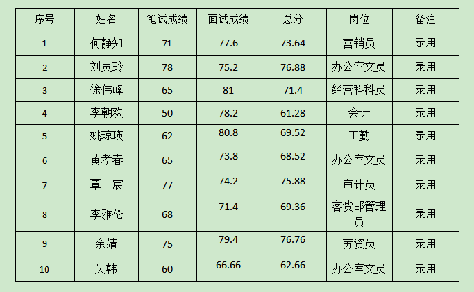 根據(jù)《湖南懷化公路運(yùn)輸集團(tuán)有限責(zé)任公司招聘公告》的要求,經(jīng)公開(kāi)報(bào)名、資格審查、筆試、面試、體檢等程序,擬錄用以下人員,現(xiàn)予以公示。公示期間如對(duì)擬錄用人員有異議或有其他問(wèn)題,請(qǐng)以書(shū)面形式并署真實(shí)姓名和聯(lián)系方式,及時(shí)向湖南懷化公路運(yùn)輸集團(tuán)有限責(zé)任公司紀(jì)檢監(jiān)察部門(mén)反映。材料郵寄(送達(dá))地址:懷化市鶴城區(qū)迎豐西路238號(hào)(懷運(yùn)集團(tuán)紀(jì)檢監(jiān)察室),經(jīng)公開(kāi)調(diào)查核實(shí),如果公示對(duì)象存在影響錄用問(wèn)題的將取消錄用資格。